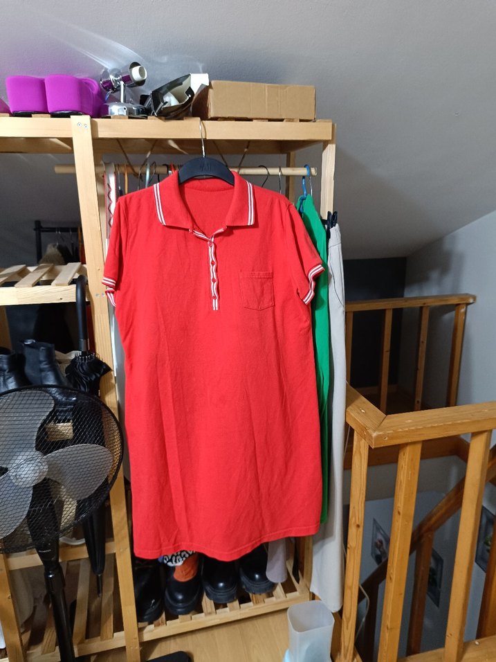 Kırmızı renkli, polo yakalı ve kısa kollu midi elbise. Yumuşak pamuktan üretilmiş, rahat ve salaş kesim, günlük kullanıma uygun şık bir parça.