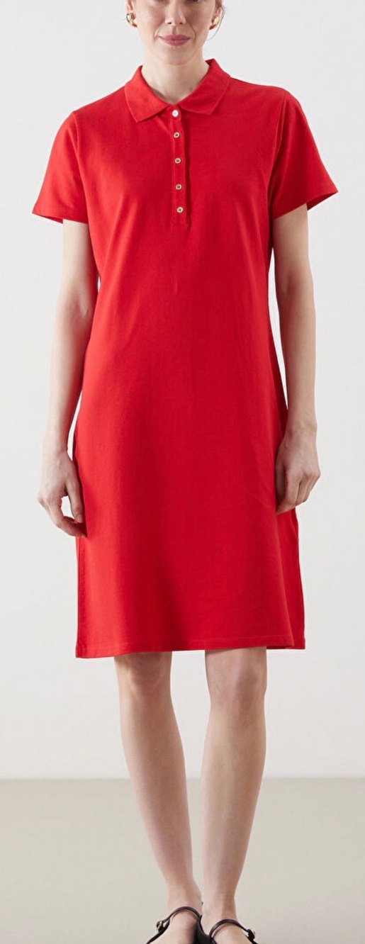 Kırmızı Polo Yaka Pike Elbise Midi Boy 46 Beden (Sıfır)
