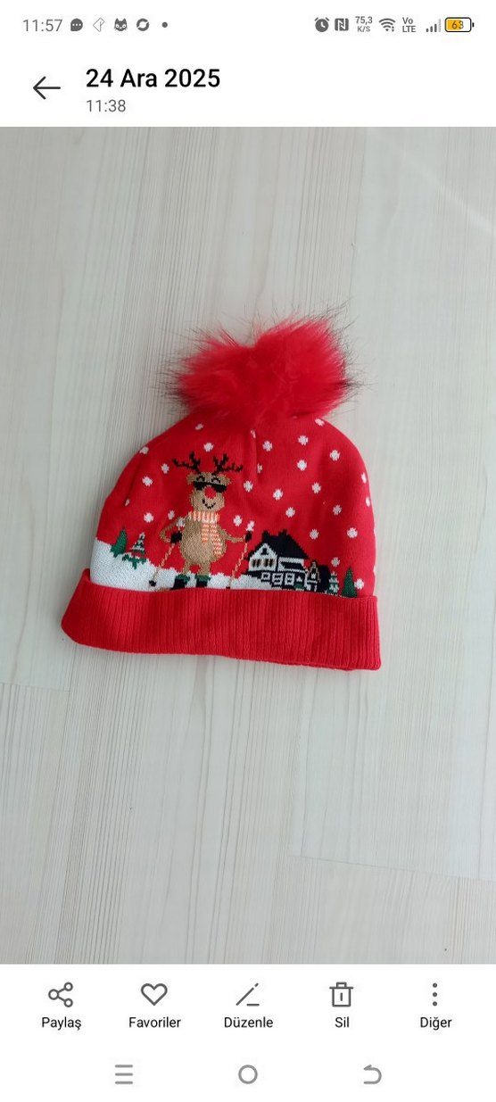 Kırmızı renkli, örgü kadin bere, üzerinde geyik ve ev desenleri bulunur, üstünde yumuşak ponpon vardır.