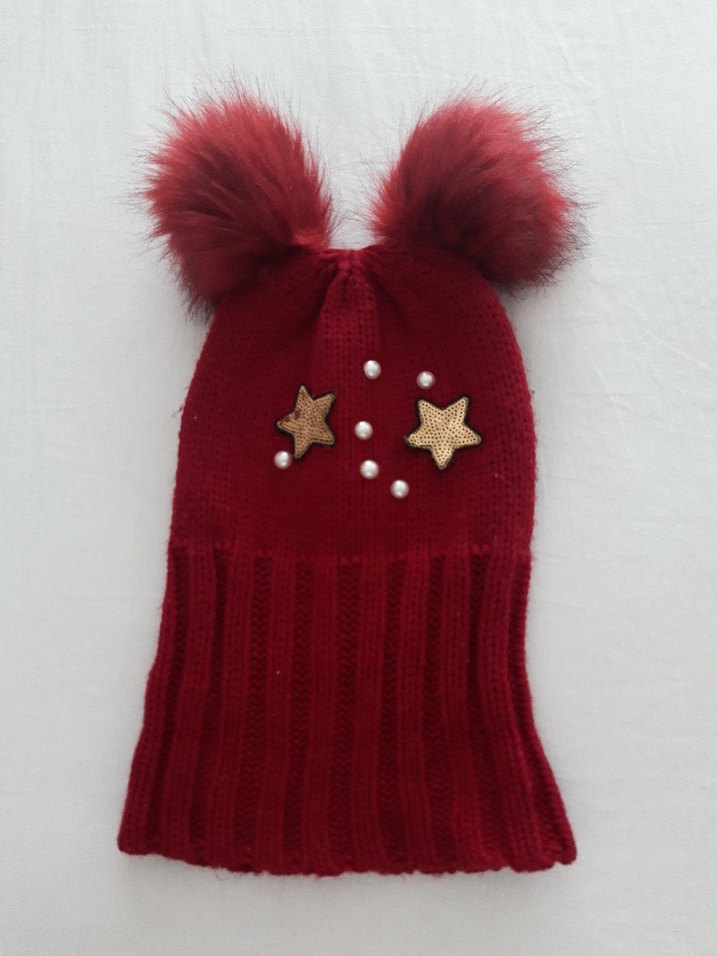Kırmızı örgü kiz cocuk bere, iki tüylü ponpon ve yıldız ile inci süslemeleriyle rahat sokak stili sunar. ❄️