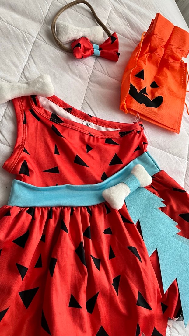 Canlı renklerde, siyah baskılı kırmızı elbise ve mavi fiyonk detaylı, papyonlu çakıl kıyafeti. 1 kere ay çekiminde giyildi yırtık sökük yok