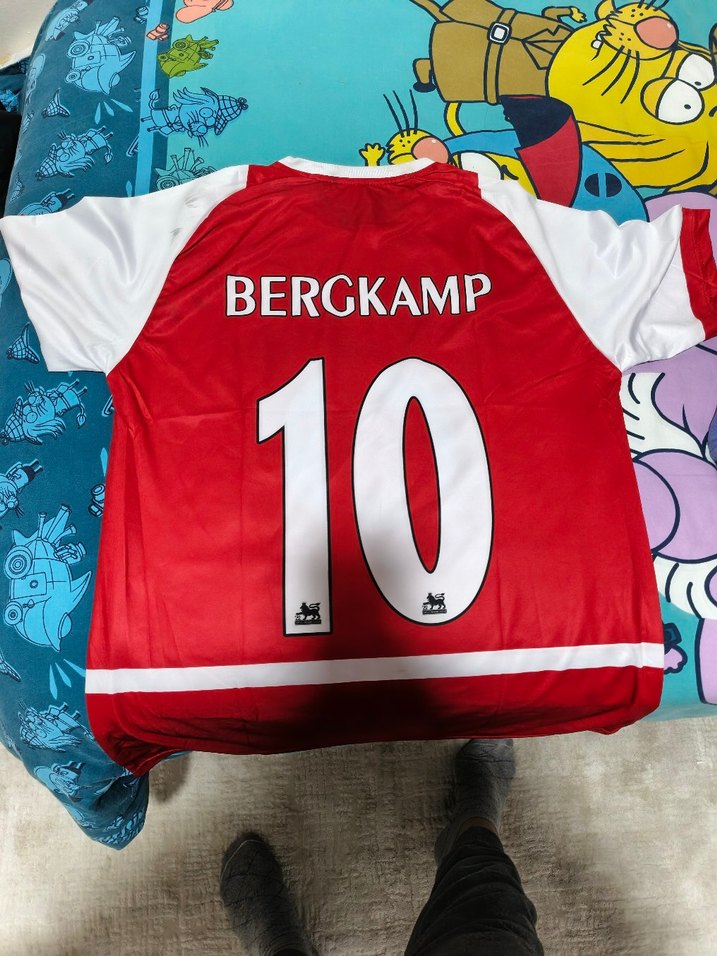 Kırmızı, kısa kollu, bisiklet yakalı, vücuda oturan erkek forması. Yumuşak ve sıcak kumaştan, Velcro detaylı ve renkli baskılı, sırtında 'BERGKAMP 10' yazılı.