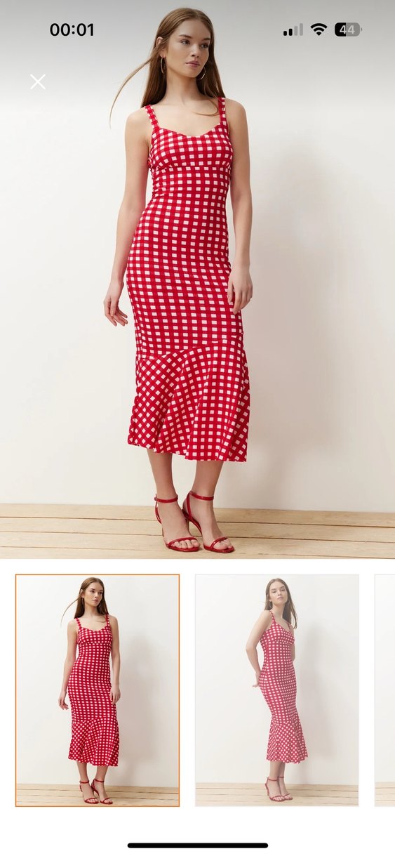 Kırmızı pötikareli midi elbise, kayık yaka ve ince askılıdır. Etek kısmında pile detayları bulunur. Rahat kesimi ve şık deseniyle romantik akşamlar için uygundur. ❤️
