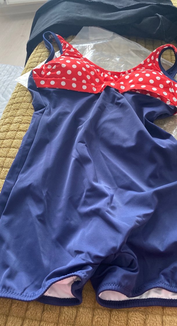 Askılı, kırmızı puantiyeli üst kısmı ve parlak mavi gövdesiyle, drapeli, vücuda oturan kadın mayo. Sifir urundur