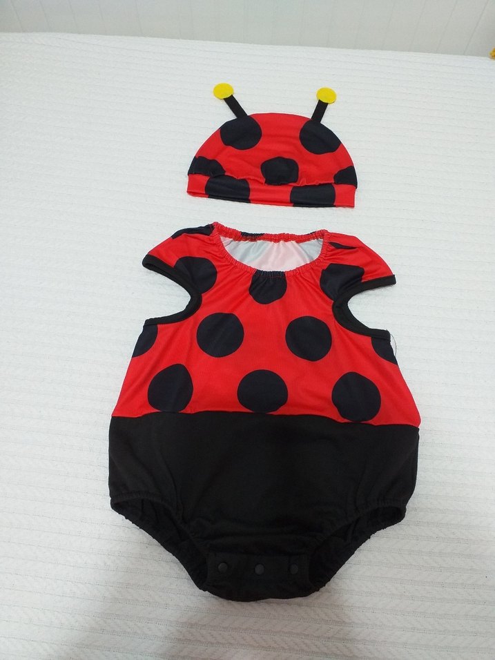 Büyük siyah puantiyeli, fırfırlı kollu renkli bebek kız tulumu ve uyumlu uğur böceği temalı şapka.