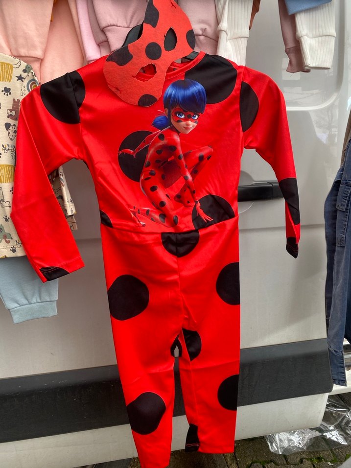 Bu dar kesim çocuk kostümü, renkli kırmızı ve siyah puantiyeli desen, balıkçı yaka ve uzun kollara sahiptir. Fermuarlı ve pop kültür karakteri baskılıdır.