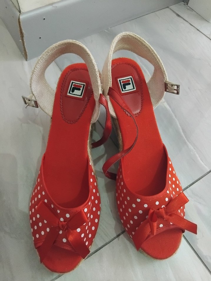 Kırmızı renkli, beyaz puantiyeli dolgu topuklu ayakkabılar. Tokalı kayış ve retro tarzıyla, lastik malzemeden üretilmiştir, günlük kullanım için uygundur.