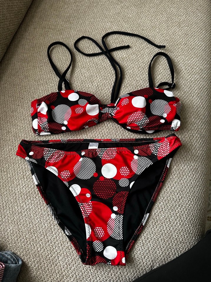 Kırmızı puantiyeli, düğmeli ve ince askılı, retro tarzda, sıkı oturan iki parçalı bikini.sıfır ürün bedeni olmadığı için satılıyor
