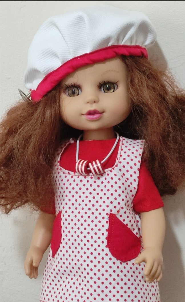 Kahverengi kıvırcık saçlı bebek, kırmızı tişört ve kırmızı puantiyeli beyaz elbise ile beyaz şapka takıyor.