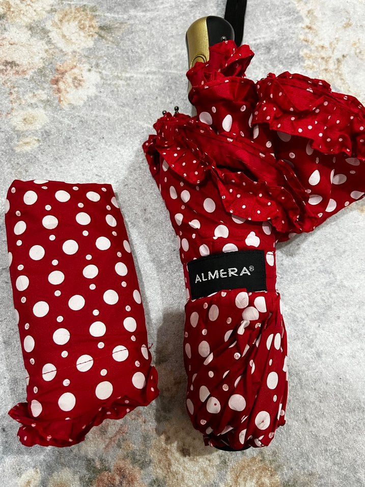 Beyaz puantiyeli kırmızı kadın şemsiye, fırfırlı detaylarıyla renkli ve bohem bir tarz sunar. ALMERA markalı, kompakt tasarım. ☂️