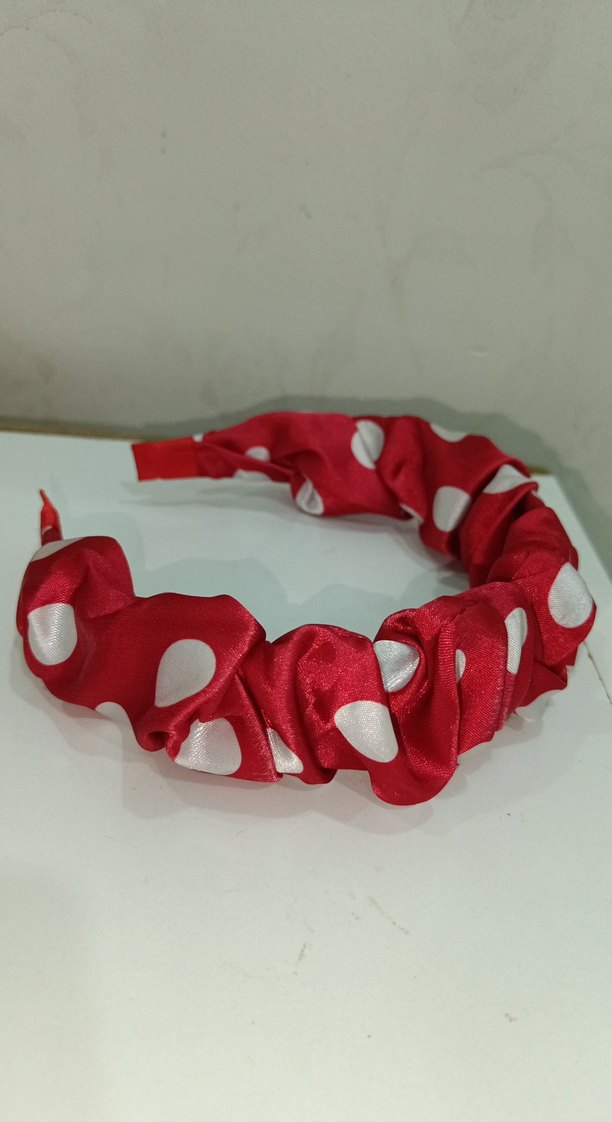Kırmızı, beyaz puantiyeli, fırfırlı ve sentetik kumaştan yapılmış saç bandı, renkli sokak modası için uygundur.