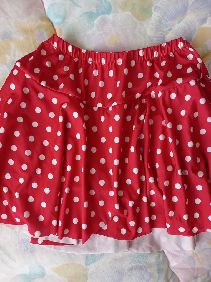 Kırmızı üzerine beyaz puantiyeler ve fırfırlar bulunan, yumuşak sentetik kumaştan yapılmış, bol kesimli bir etek