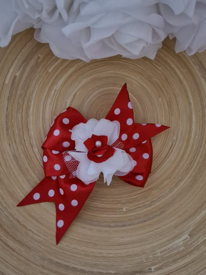 Çocuklar için kırmızı puantiyeli fiyonk ve beyaz kumaş çiçek detaylı klasik tarzda renkli saç tokası.
