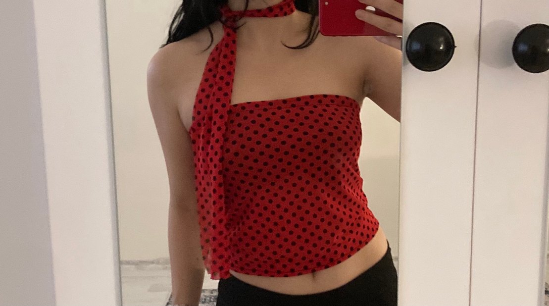 Koyu kırmızı puantiyeli, drapeli kadın üst. Sentetik kumaştan, cesur ve retro streetwear tarzında. xs-s uyumludur. Göğüs kısmı astarlı.