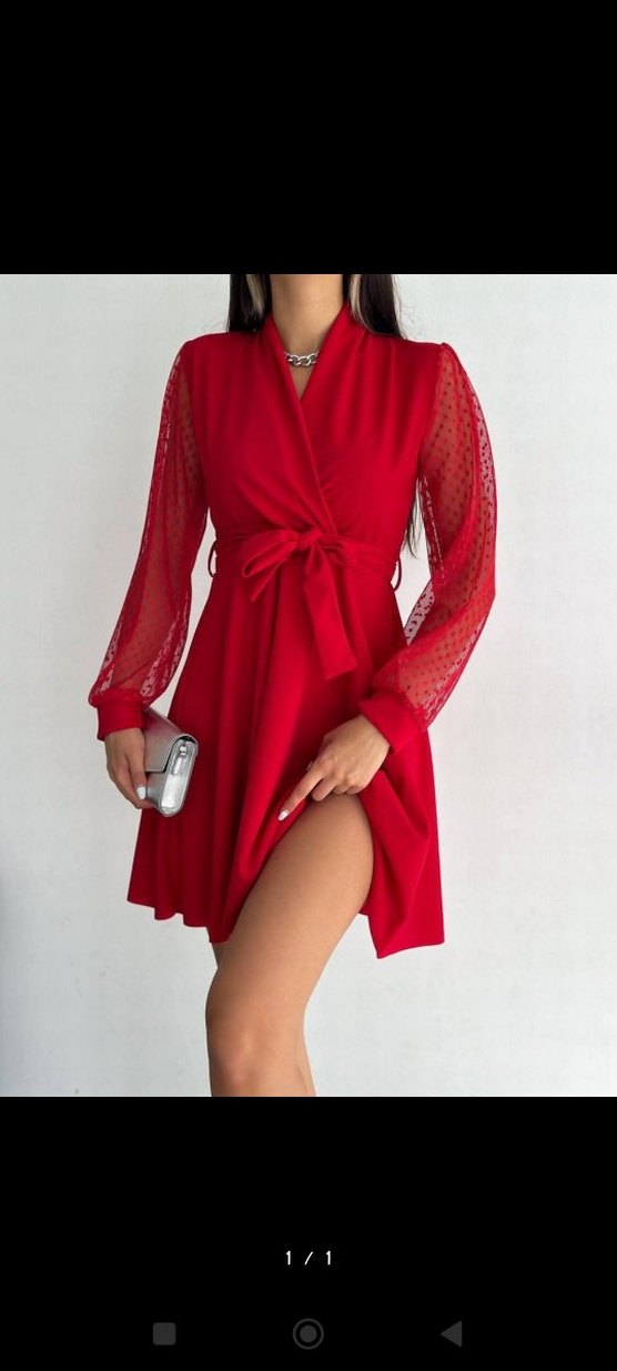 V yaka ve uzun şeffaf puantiyeli kollara sahip, kemerli kırmızı mini elbise. Gösterişli ve romantik geceler için uygun. ❤️