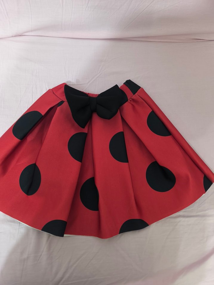 Kırmızı renkte, büyük siyah puantiyeler ve belde siyah fiyonk detaylı, bol kesim kız çocuk eteği. Oyunlu ve fırfırlı tasarımıyla dikkat çeker.