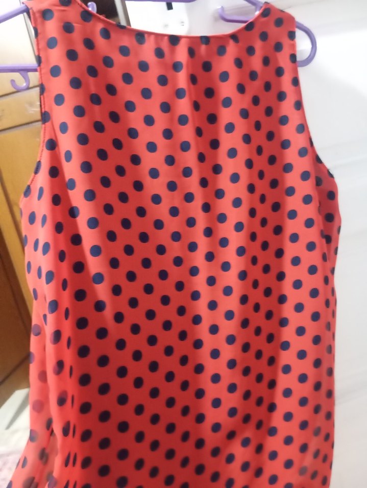 Kırmızı zemin üzerine lacivert puantiyeli, kolsuz ve bluz