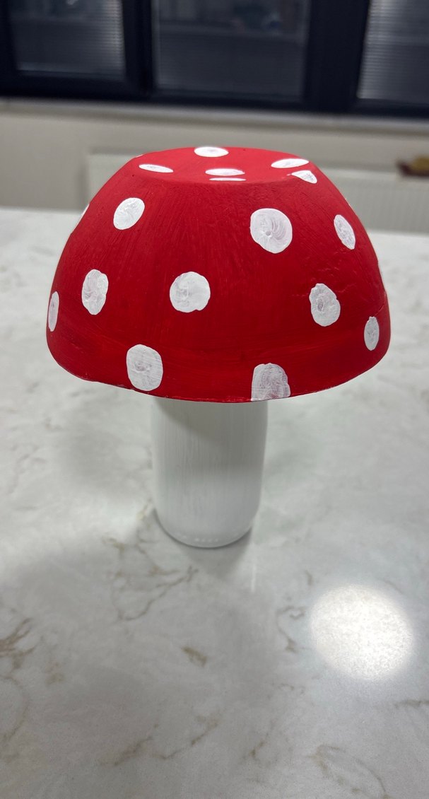 Beyaz puantiyeli kırmızı mantar figür, düz silindirik sap ve yuvarlak kapak şeklinde. Alçı