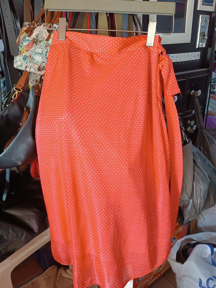 Kırmızı, parlak ve ipeksi kumaştan, bol kesim ve drapeli midi hamile eteği. Vintage puantiyeli desene sahip, günlük kullanı beli 34cm boyu 78cm