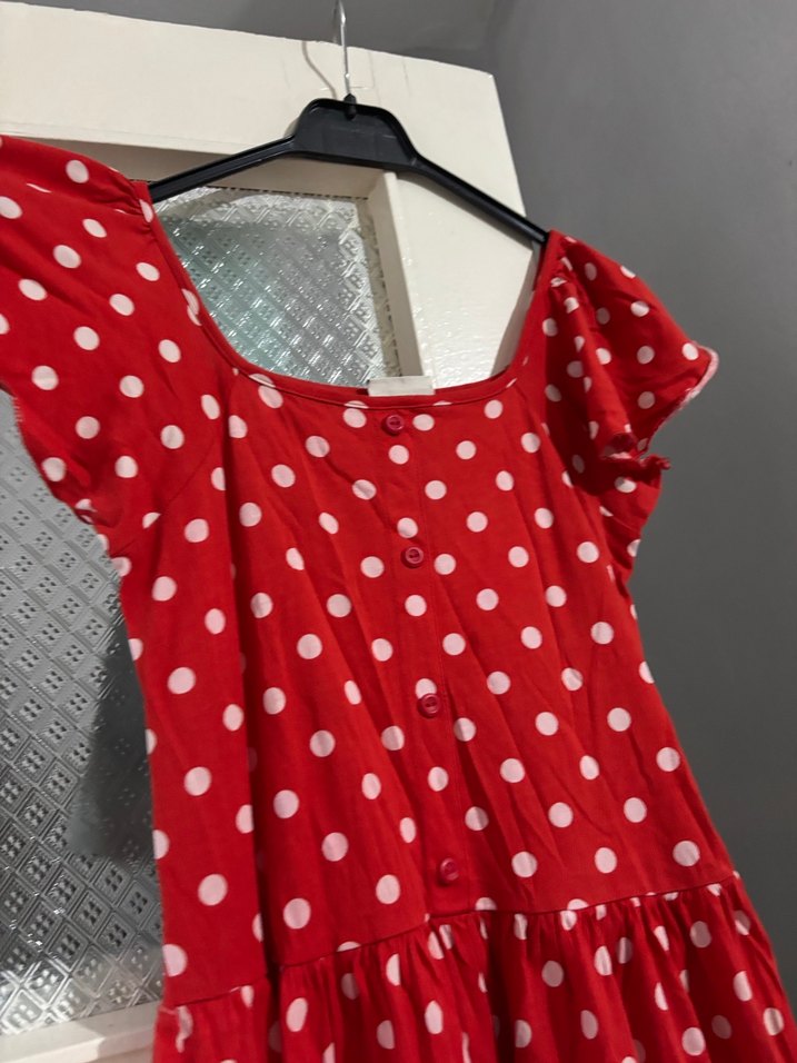 Kırmızı puantiyeli mini elbise, bisiklet yakalı, kısa kollu ve düğmeli ön detaylıdır. Salaş kesimiyle günlük vintage stil için uygundur.