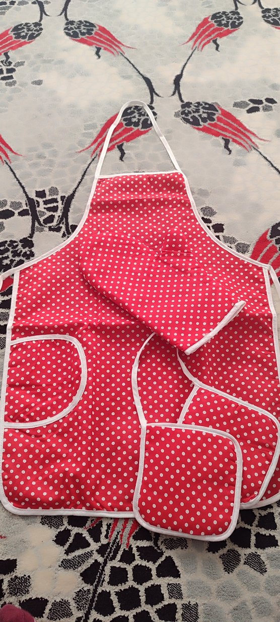 Kırmızı, beyaz puantiyeli desenli mutfak önlüğü, beyaz kenar ve boyun askıları ile cepli tek eldiven ve tutacak 3 ,lü set Paketli sıfır ürün