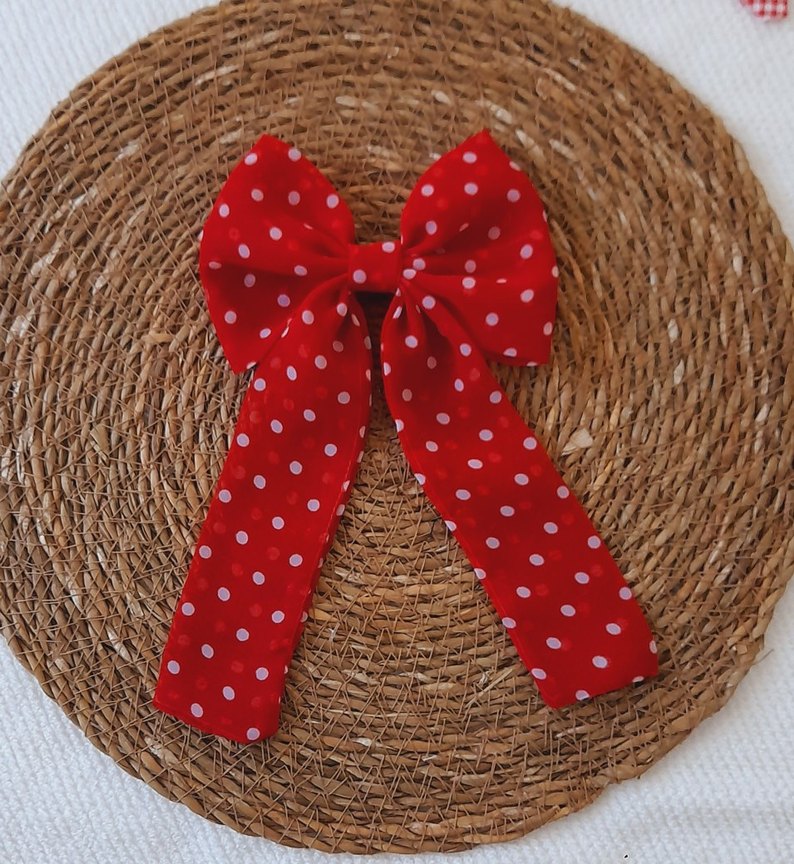Beyaz puantiyeli kırmızı örgü kumaştan yapılmış, renkli ve vintage tarzda kadın saç aksesuarı fiyonk.