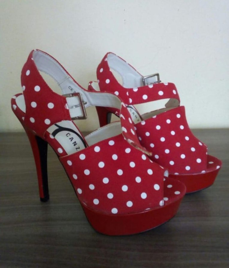 Kırmızı ve beyaz puantiyeli, tokalı platform topuklu ayakkabılar. Cesur retro tarzda, romantik akşamlar için uygun. Kauçuk malzemeden yapılmıştır.