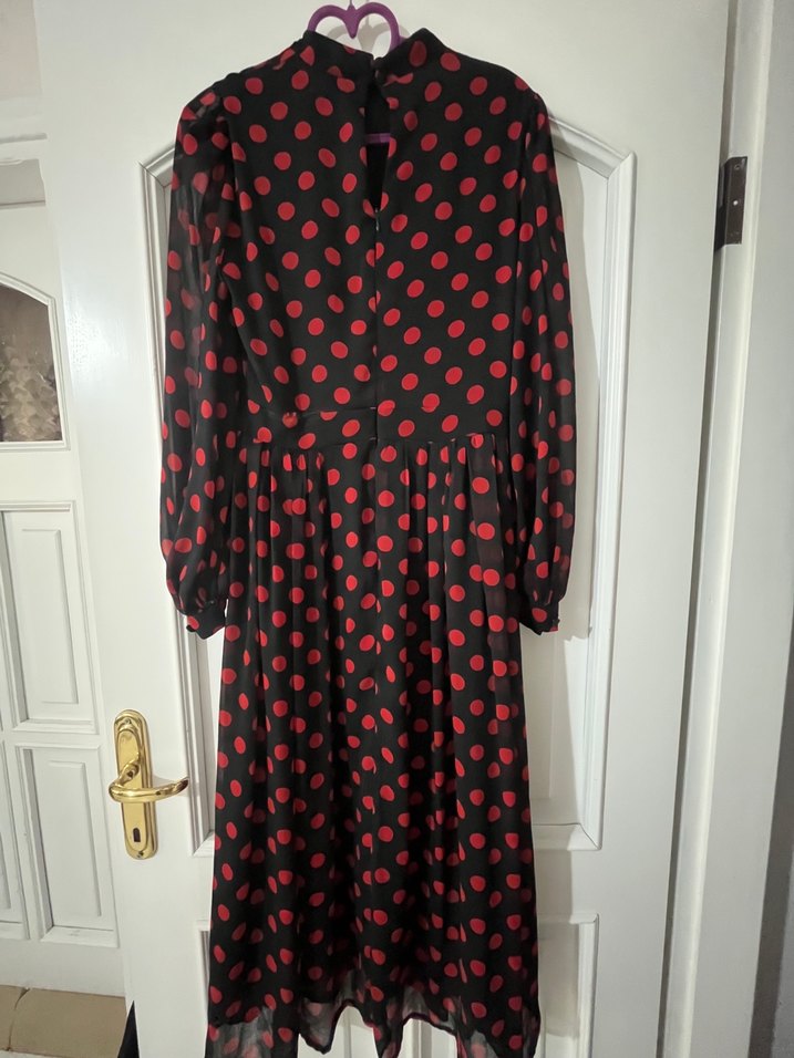Uzun, bol kesim elbise, uzun kollu ve yüksek yakalıdır. Koyu zemin üzerinde kırmızı puantiyeler ve ön düğmeler bulunur. Vintage, gotik ve bohem tarzına uygundur. Romantik akşamlar için ideal.