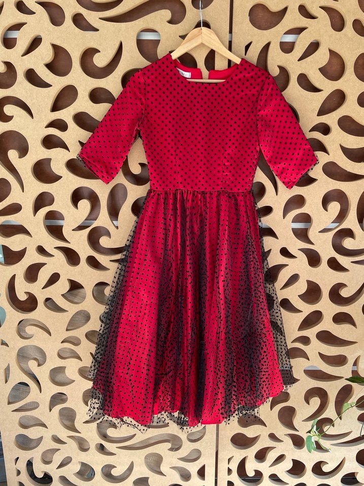 Kız çocuklar için kırmızı, uzun kollu, tekne yaka ve renkli puantiyeli desenli, vücuda oturan elbisedir. Fırfır detayları ve yumuşak sentetik kumaşıyla bohem ve retro tarzını yansıtır.