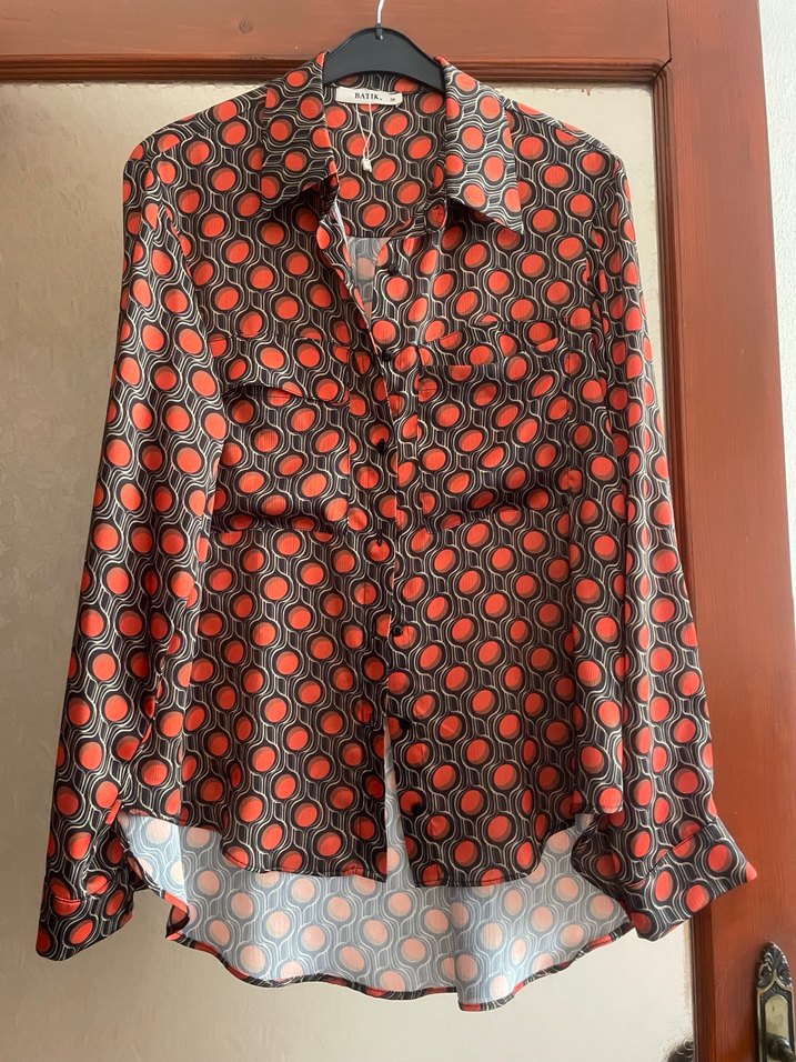Bol kesim, düğmeli ve yakalı bu gömlek koyu kırmızı tonlarında retro puantiye desenine sahip. Uzun kollu ve midi boyda, yumuşak sentetik kumaştan yapılmıştır.
