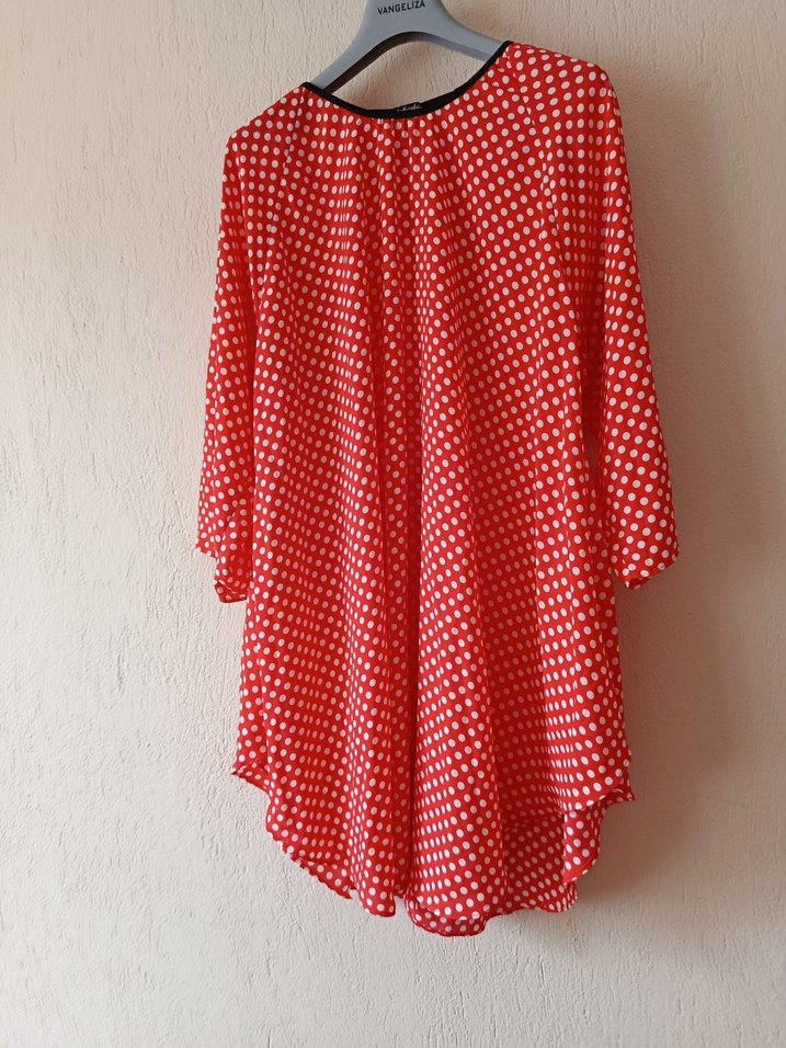 Kırmızı, puantiyeli, uzun kollu, midi boyda, bol kesim ve drapeli tunik. Yuvarlak yaka ve renkli tasarımıyla retro ve çağdaş stil birleşimi.
