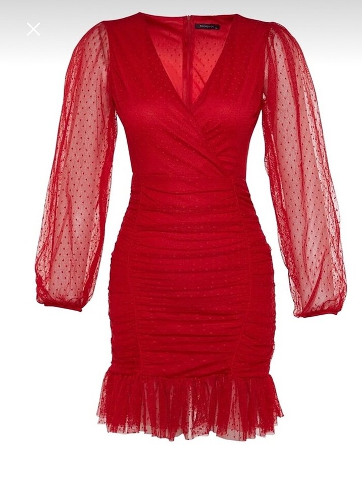 Kırmızı, parlak puantiyeli, uzun kollu, V yakalı dar kesim elbise. Drapeli tasarımı ve fırfırlı etek ucu ile göz alıcı. Romantik akşamlar için ideal. ❤️ sorunsuz 1 kere yılbaşında giyildi