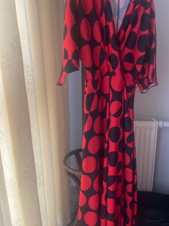 Koyu kırmızı ve siyah puantiyeli, uzun ve bol kesim elbise. Drapeli tasarım, V yaka ve askılı kollara sahip. Retro ve çağdaş tarzı bir araya getirir.