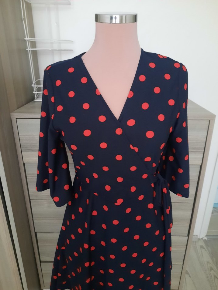 Kırmızı puantiyeli, kuriveze. yaka, kısa kollu kadın elbise. Düğmeli detayları ve bol kesimiyle günlük kullanıma uygun, yumuşak sentetik kumaştan yapıldı.