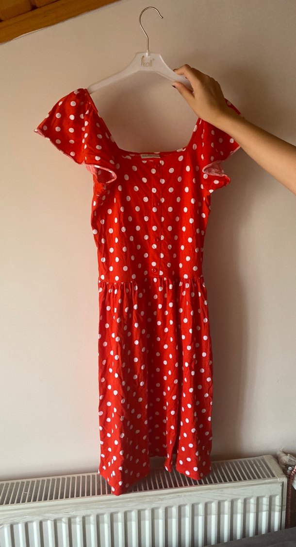 Kısa kollu, V yaka ve fırfır detaylı kırmızı beyaz puantiyeli, vücuda oturan midi elbise. Yumuşak sentetik kumaştan, vintage bohem tarzında.