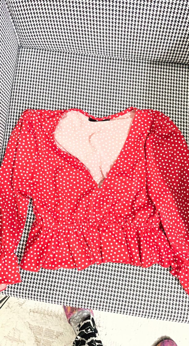 Kırmızı Puantiyeli V Yakalı Kadın Bluz