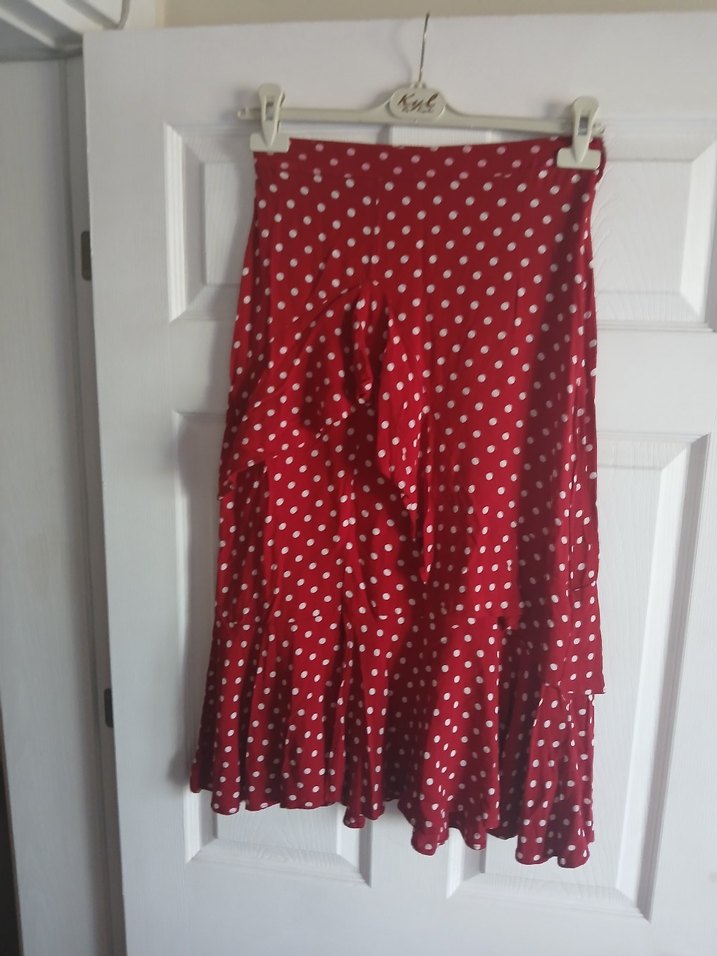 Kırmızı zemin üzerine beyaz puantiyelerle ve volan detaylarıyla tasarlanmış, rahat kesimli midi etek. Yumuşak dokulu kumaştan, günlük kullanıma uygun, vintage bohem tarzda.