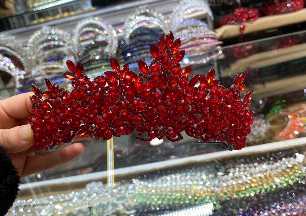 Canlı kırmızı pul işlemeli ve cam taşlı, cesur ve gösterişli kadın saç aksesuarı.