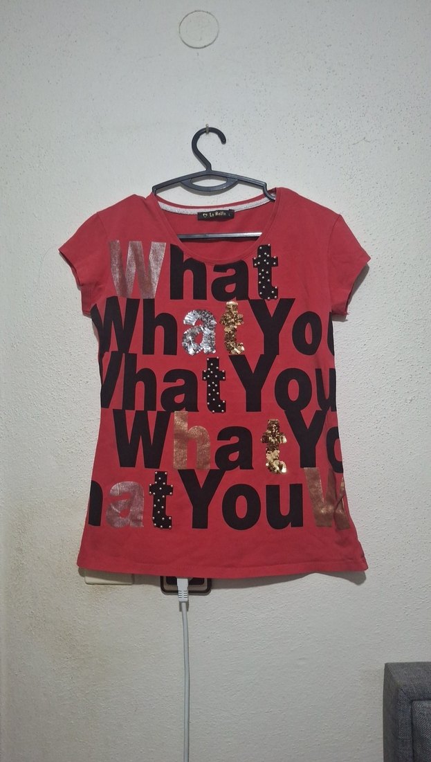 Kırmızı renkli, kısa kollu ve yuvarlak yakalı tişört Renkli baskı ve pul işlemeli detaylara sahip, rahat kesim ve yumuşak kumaştan üretilmiştir.