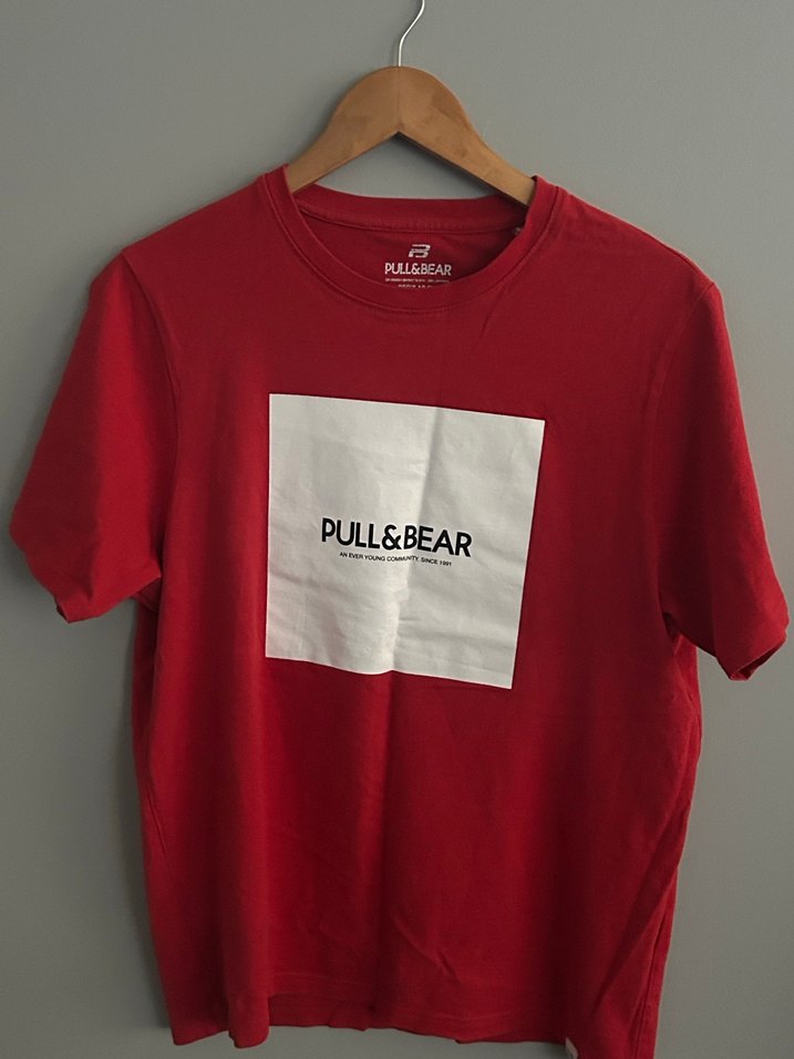 Kırmızı PULL&BEAR baskılı erkek tişört, kısa kollu, yuvarlak yaka ve bol kesimdir. Yumuşak kumaştan üretilmiş, spor ve rahat bir görünüme sahiptir. ♂️