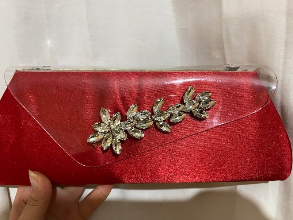 Kadınlar için kırmızı parlak sentetik kumaştan çanta.