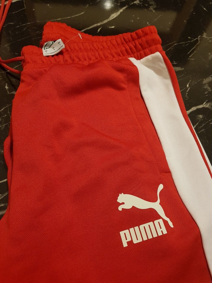 Fermuarlı cepleri ve baskılı Puma logosu olan, parlak kırmızı renkte, ince kesim erkek eşofman altı. ♂️