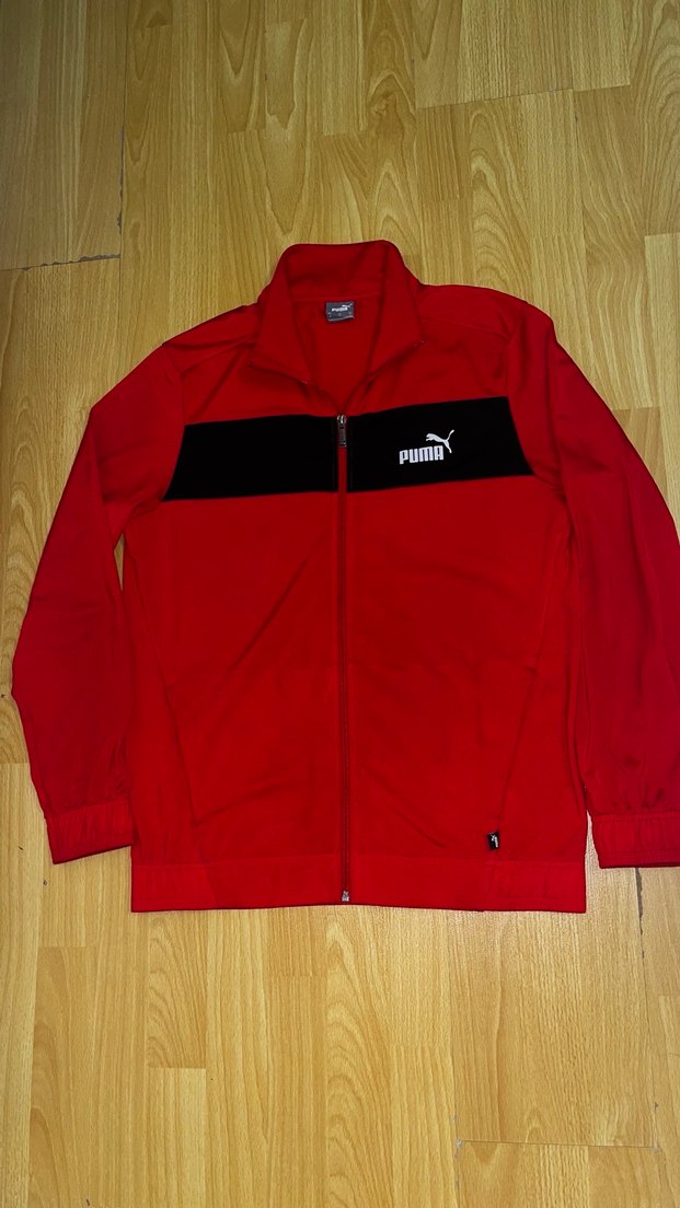 Kırmızı, fermuarlı ve uzun kollu Puma sweatshirt. Normal boyda, dar kesim ve parlak kumaşlı, spor ve günlük kullanıma uygun. Defosuz bir kere yıkandı