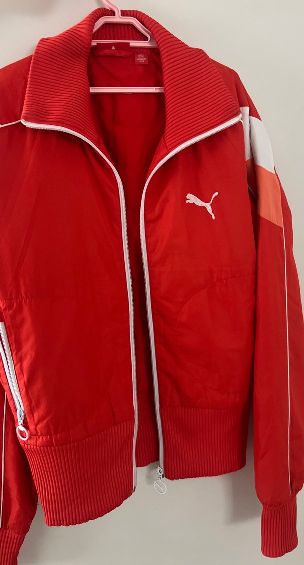Parlak kırmızı sentetik kumaştan yapılmış, yüksek yakalı ve uzun kollu, dar kesim kadın spor ceketi. Fermuarlı cepleri ve normal midi boyu ile spor ve sokak tarzına uygun. Göğüste Puma logosu bulunur. ♀️