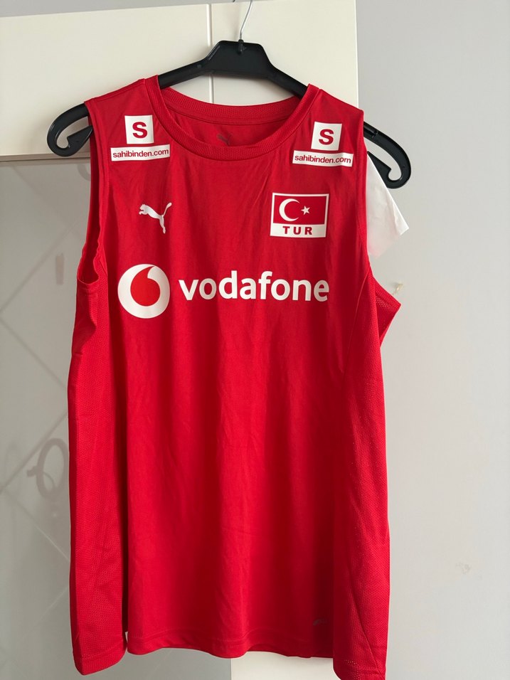 Kırmızı renkte, kolsuz Puma spor forması. Sentetik kumaştan, baskılı Vodafone ve Türkiye bayrağı logoları ile Velcro detaylıdır. Spor ve sokak giyimi için uygundur.