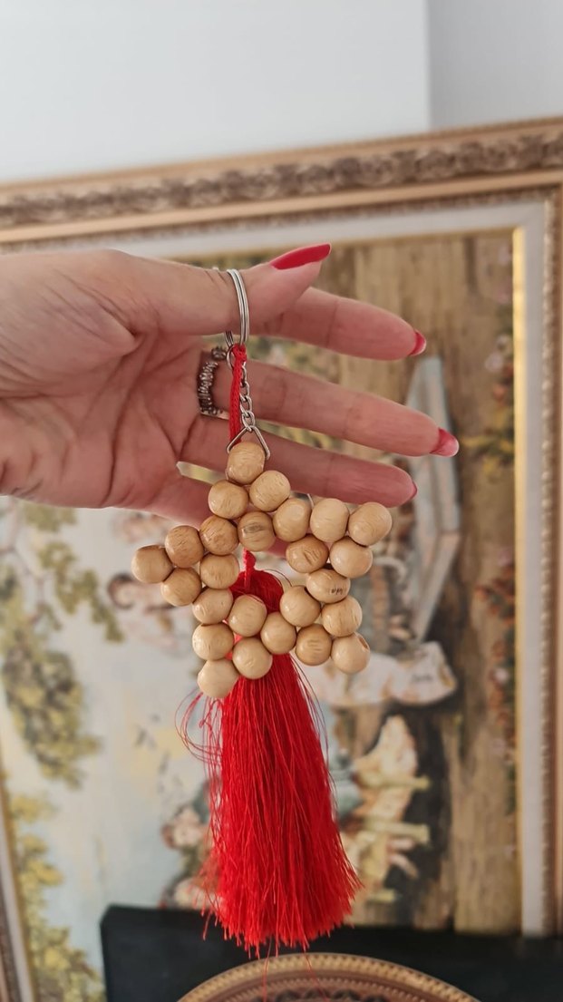 Ahşap boncuklarla yıldız şekli oluşturulmuş, kırmızı püsküllü bohem tarzda kadın anahtarlık. Canlı ve retro bir görünüm sunar. şans anahtarlığı ,çantaaksessuarı #hediyw #sevgilulergünü #yıldızanahtarlık