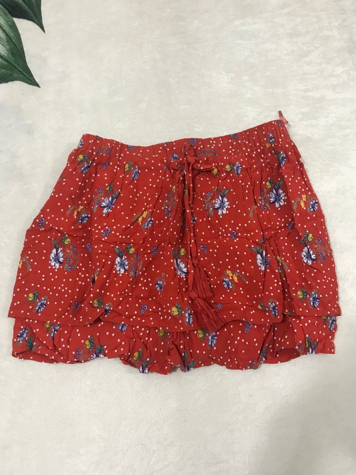Kırmızı, bol kesim, püsküllü ve fırfırlı mini etek. Çiçekli ve puantiyeli desenli, pamuklu ve rahat dokulu, bohem tarz için uygun.