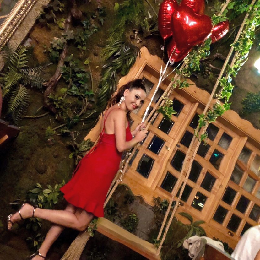 Kırmızı, mini boy, halter yaka ve püsküllü detaylara sahip, etnik desenli, ipeksi dokulu, bohem tarzda elbise.