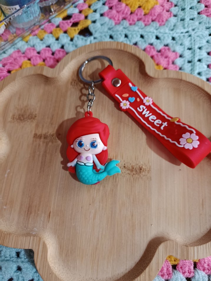 Renkli anahtarlık, kırmızı püskül ve 'sweet' yazılı bant ile tatlı denizkızı figürü içerir. Bohem ve sokak stili için uygundur. ♀️