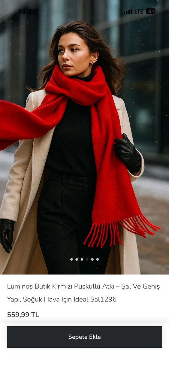 Açık kırmızı renkte, püsküllü uçlara sahip yün atkı. Soğuk havalar için uygun, rahat ve trend sokak stili görünüm sunar. Sadece bir iki kere kullanıldı. Marka temsili